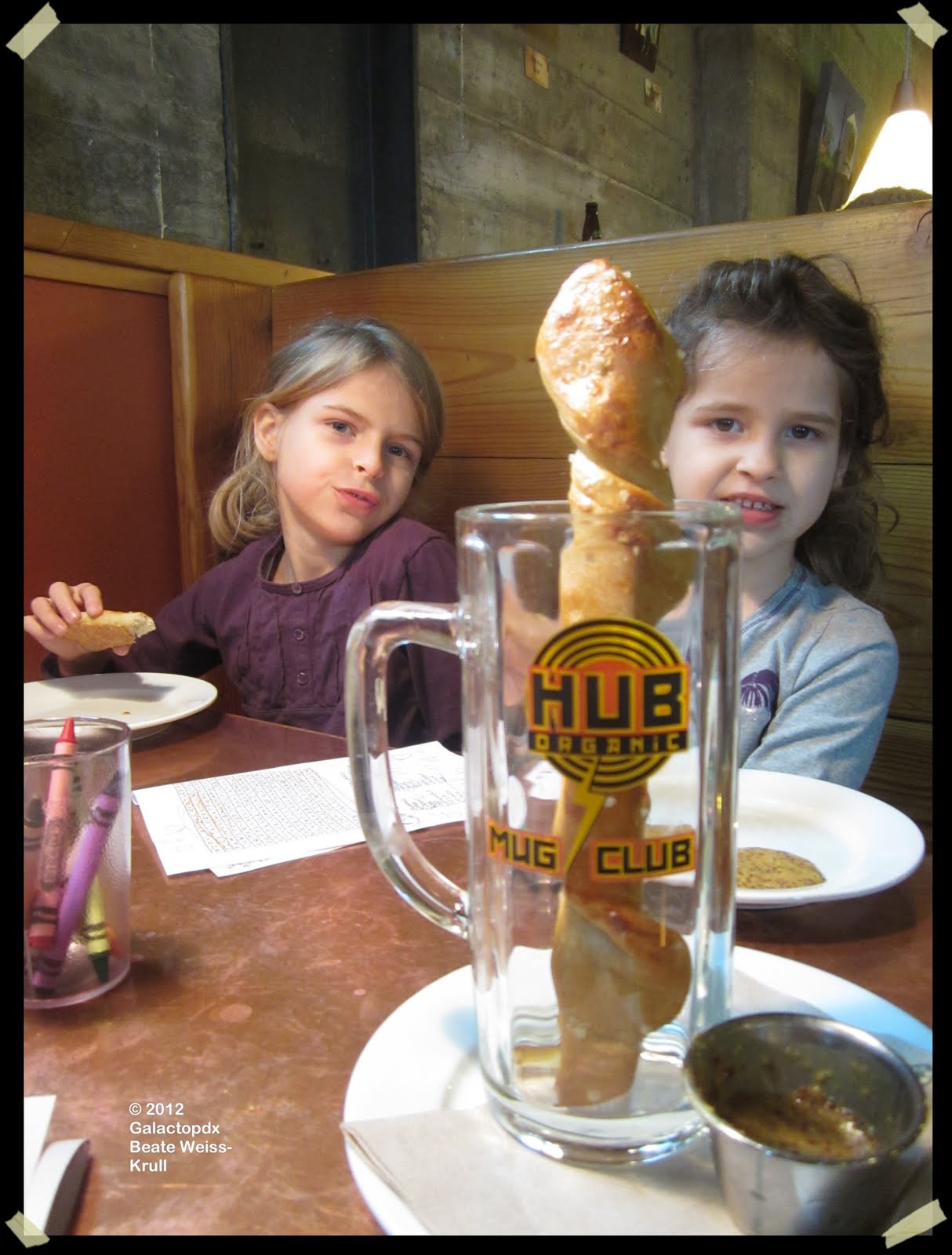 ...a trip back to the east side of Portland to Hopworks - one of the girlies favorite restaurants - for a late lunch. Pretzel bread - without the butter brushed on - is a favorite, then hot dogs, and fries. And drinks? Ok - it was beer all around. Root beer for the girlies, and delicious Hopworks beer for the parental units.
